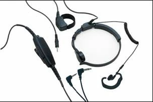 Ohrhörer-/Kehlkopfmikrofon-Kombination, separate Sendetaste mit Klettbefestigung.
