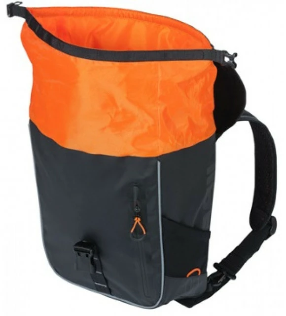 Der Rucksack ist aus wasserdichtem, mattschwarzem Tarpaulin. Die wasserdichte Tasche hat einen Rolltop-Verschluss und geklebte Nähte. Sie kann auch einem heftigen Regenschauer standhalten. Daher bleiben deine Sachen beim Radfahren trocken. In den verschiedenen Fächern kannst du alles gut verstauen. Ideal für deine Bücher, das Smartphone, die Kugelschreiber. Der Fahrradrucksack hat auf allen Seiten Reflexionszonen.