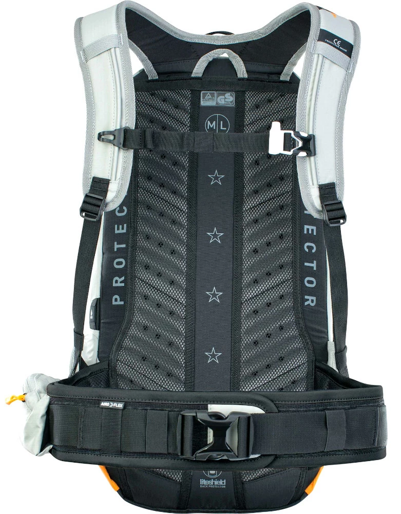 Absolut notwendige Körpernähe eines Rückenprotektors, vereint mit einem Höchstmaß an Belüftung. Der Rückenbereich ist mit einem großen zentralen Belüftungskanal und zwei Reihen „Entlüftungsgittern“ versehen. EVA-Schaum-Streifen mit Belüftungslöchern und einer speziellen, schrägen Giebelfräsung reduzieren die Kontaktfläche zum Rücken und verbessern so die Luftzirkulation. Der extrabreite, ergonomisch geformte Hüftgurt besteht aus AIRO FLEX Material.