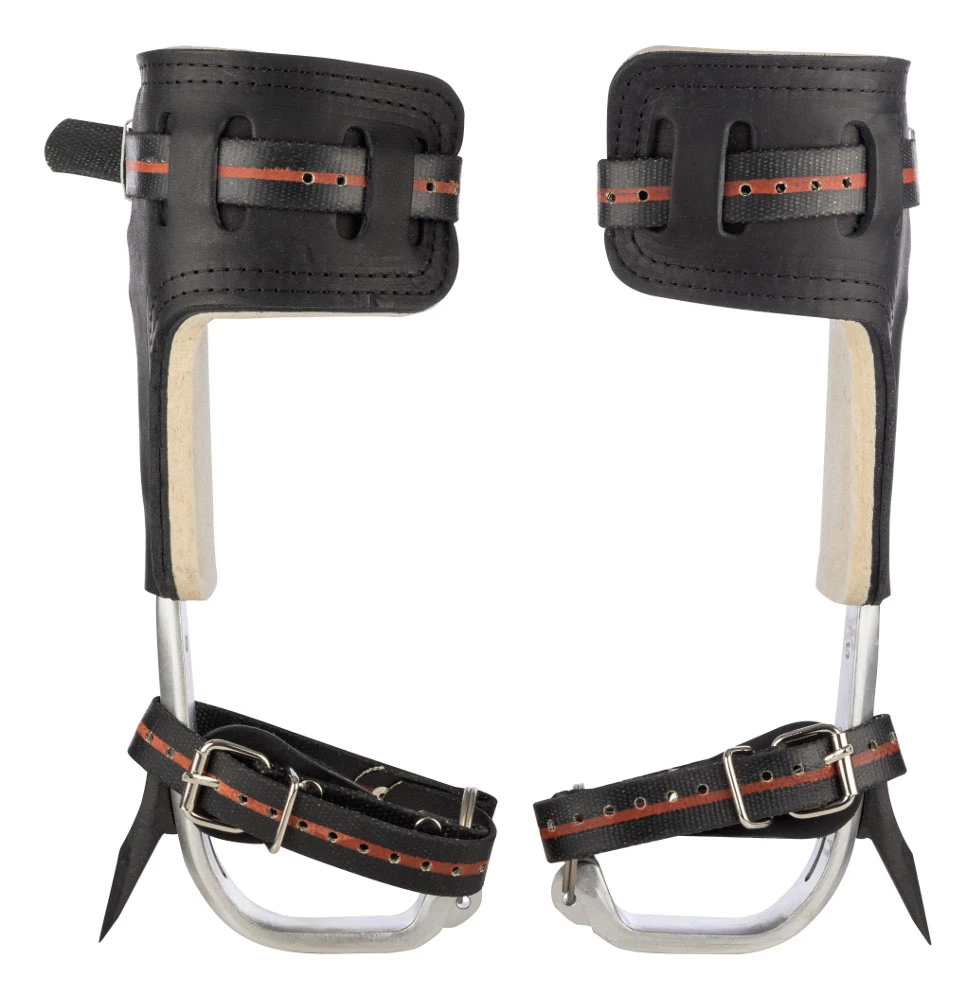 Baumsteigeisen aus Aluminium mit weichem langen Wadenpolster aus Leder und Filz sowie austauschbaren Dornen aus gehärtetem Stahl. Die verstellbaren Befestigungsriemen sind wasserdicht beschichtet. Das Baumsteigeisen wurde speziell für den professionellen und gewerblichen Einsatz im Bereich Forst und Baumpflege konzipiert. Die Wadenpolster verhindern Druckstellen an den Beinen und sind außerdem höhenverstellbar. Die Form wurde dem menschlichen Bein angepasst, somit sind auch längere Einsätze kein Problem. Mit 2 kurzen Dornen und 2 langen Dornen, die sich je nach Einsatzzweck und Baumart einfach und schnell tauschen lassen.