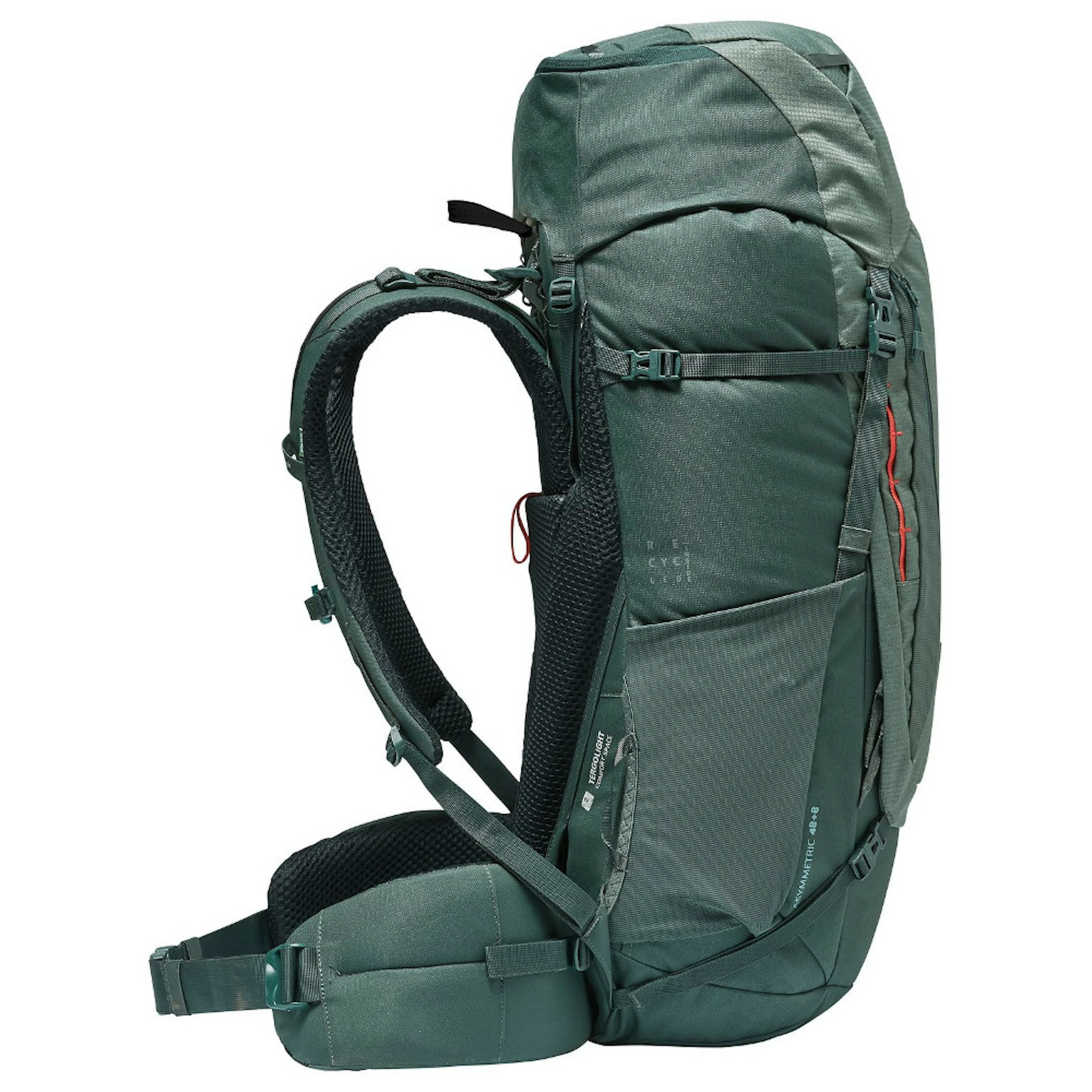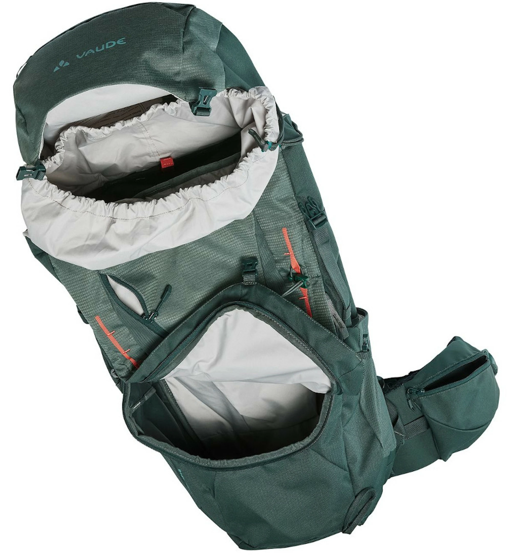 Der Trekkingrucksack mit 48 Liter Volumen ist perfekt für kürzere Trekkingtouren, Alpintrekking, Pilgern sowie Backpacking. Auch bei schweren Lasten sorgt das Tergolight Comfort Space-Tragesystem für hohen Tragekomfort. Die Aussparung zwischen den unteren Rückenpolstern nimmt den Druck vom Iliosakralgelenk und entlastet den unteren Rücken. Rückenlänge und Lastenpositionierung lassen sich individuell einstellen. Der Trekkingrucksack ist ergonomisch auf die Bedürfnisse eines ambitionierten Wanderers angepasst. Er hat ein kürzeres Rückenteil, etwas kürzere, speziell geformte Ergoshape-Schulterträger und einen weich gepolsterten, vorgeformten Hüftgurt. Auch die Fächeraufteilung ist zweckmäßig. Das geräumige Hauptfach des Trekkingrucksacks ist von oben sowie von vorne zugänglich. Alles, was unterwegs schnell zur Hand sein muss, findet im elastischen Frontfach Platz und ein abtrennbares, extra Bodenfach trennt bei Bedarf Schmutziges von Sauberem. Trinkflasche, Kamera oder Mütze sind in den elastischen Seitenfächern mit einem Griff erreichbar, ohne den Rucksack abzusetzen. Steigeisen, Helm und Trekkingstöcke finden an der Daisy Chain oder den zusätzlichen Materialschlaufen Platz – gewappnet für jedes Terrain! An den Rucksackseiten sowie unter dem Deckel befinden sich praktische Kompressionsriemen. Die Schnalle am oberen Riemen kann zudem als Ersatz dienen, falls unterwegs mal eine der Schnallen zu Bruch gehen sollte. Der höhenverstellbare Deckel schafft zusätzliches Rucksackvolumen. Der Trekkingrucksack besteht überwiegend aus Recyclingmaterialien. Das VAUDE Green Shape-Label steht für ein umweltfreundliches, funktionelles Produkt aus nachhaltigen, bluesign® zertifizierten Materialien.