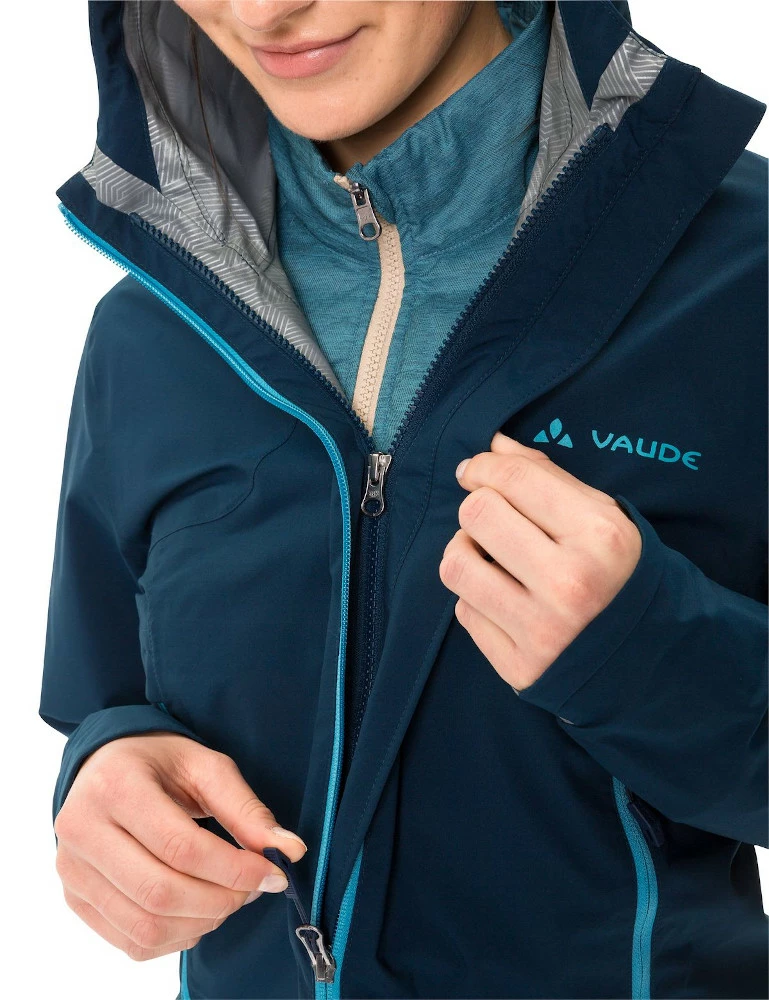 Die 2,5-lagige Ceplex Active-Membran hält Nässe zuverlässig draußen, wasserdichte Taschen sorgen zudem dafür, dass Karte, Smartphone und andere Wertsachen stets bestens geschützt und trocken bleiben. Die einstellbare Kapuze hält den Kopf auch bei anhaltend schlechtem Wetter trocken, das durchdachte Belüftungssystem sorgt zudem für ein optimales Trageklima. Doch auch die Innenjacke geizt nicht mit Funktion – sie ist im Brustbereich und an den Schultern mit einer Wattierung aus PrimaLoft® Black Insulation 100%Eco versehen, die an sensiblen Stellen für mehr Wärme an kalten Wintertagen sorgt. Zwei Reißverschlusstaschen und Stretch-Einlagen bieten viel Flexibilität in jeder Tragesituation, der Stehkragen verringert Zugluft und garantiert ein ausgezeichnetes Tragegefühl. Die Materialien werden der Umwelt zuliebe nach dem bluesign®-Standard hergestellt. In Kombination mit der Yaras Rain Pants wird das Regenoutfit komplett. Inklusive reflektierenden Elementen. Dieses Produkt ist mit Eco Finish umweltfreundlich wasserabweisend ohne Fluorcarbone (PFC) hergestellt. Das VAUDE Green Shape-Label steht für ein umweltfreundliches, funktionelles Produkt aus nachhaltigen Materialien.