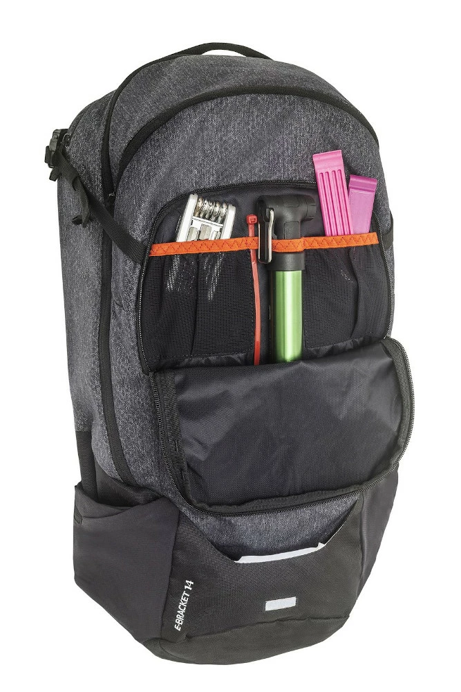 Der eBracket 14 ist ein All Mountain-Rucksack, der speziell für eBiker konzipiert wurde und mit allen Raffinessen ausgestattet ist, die unterwegs gebraucht werden. Ein separates Fach bietet auf Langstrecken Platz für einen zweiten Akku, auch ein Ladegerät ist mit wenigen Handgriffen im Rucksack untergebracht. Im komfortablen Hüftgurt, der gleichzeitig komprimierende Wirkung hat, befinden sich Fächer für abnehmbare Displays und Schlüssel. Bei den weiteren Funktionen bedient sich der eBracket 14 bei der bewährten Bracket-Serie: Helmhalterung, Regenhülle, Blinklichthalter und ein gefüttertes Brillenfach mit Zip-Pocket sind ebenfalls mit an Bord. Durch die raffinierte Fachaufteilung befinden sich Akku und weitere schwere Gegenstände stets nahe am Rücken – das bedeutet einen höheren Tragekomfort auf technischen Streckenabschnitten und eine optimale Gewichtsverteilung. Praktisch ist auch der Werkzeug-Organizer im Frontfach, der unterwegs für mehr Ordnung und im Pannenfall dafür sorgt, dass das Werkzeug schnell für Reparaturen zur Hand ist. Der eBracket 14 ist nach Green Shape 2.0 – Kriterien umweltfreundlich hergestellt. Die ebenfalls umweltfreundliche, PFC-freie Eco Finish-Behandlung lässt kleinere Regengüsse und Nässe im Nu abperlen. Damit ist der eBracket 14 der ideale Rucksack für eBiker, die nachhaltig unterwegs sein wollen.
