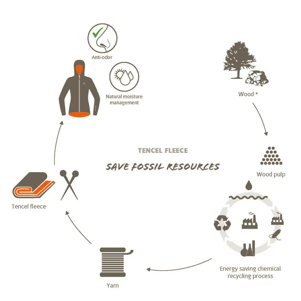 TENCEL® ist eine Faser, die zu 100 % aus dem nachwachsenden Rohstoff Holz hergestellt wird. Sie wird dank eines geschlossenen Kreislaufsystems besonders umweltfreundlich produziert und ist biologisch abbaubar. Aus der biobasierten Faser lassen sich viele verschiedene Stoffvarianten verarbeiten. Wir haben daraus als erster Outdoor-Ausrüster ein kuschlig weiches Fleece-Material entwickelt. Mikropartikel, die sich beim Waschen vom Fleece ablösen und in den globalen Wasserkreislauf gelangen, können sich in Meerwasser vollständig abbauen. Dadurch möchten wir eine Gefährdung von Umwelt und Meeresbewohnern vermeiden. TENCEL® wirkt feuchtigkeitsregulierend und trägt sich seidenweich auf der Haut. Mehr über TENCEL® erfahren.