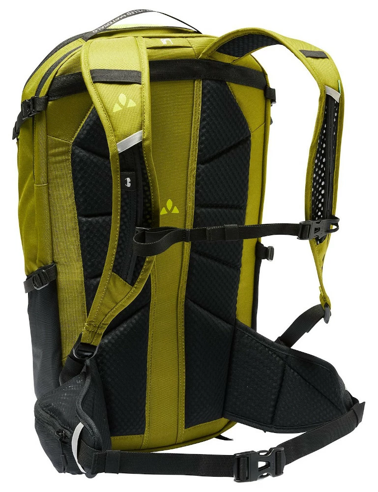 Für perfekten Sitz und gute Belüftung des 25 Liter fassenden Transalp Rucksackes sorgt das optimierte Ventex Active Rückensystem, dass durch stärkere Polsterung im Bereich der Lendenwirbelsäule Druckpunkte deutlicher entlastet. Der komfortable Hüftgurt zieht den Schwerpunkt des Rucksacks perfekt an den Rücken und sorgt in Kombination mit den Ergoshape-Schulterträgern für einen perfekten Sitz mit optimaler Bewegungsfreiheit auf dem Rad. Der Rucksack ist in drei Fächer unterteilt. Das große Hauptfach kann für bessere Organisation von Kleidung und Proviant unterteilt werden und bietet separaten Zugriff von oben oder unten. Davor befindet sich ein weiteres Fach für Brille oder Geldbeutel. Das Werkzeugfach auf der Rucksackfront nimmt gut organisiert alles auf, was bei einer Panne schnell griffbereit sein muss. Darunter liegt ein Einschubfach für Karte oder andere Dokumente. In der unteren Front verbirgt sich ein Fach, in dem der Helmhalter ordentlich verstaut werden kann. Auf dem rechten Hüftgurtflügel bietet eine Tasche ausreichend Platz für Smartphone oder Powerriegel. Zur Ausstattung gehören elastische Seitentaschen, ein separates Trinkblasenfach, Kompressionsriemen im Seitenbereich, eine Regenhülle im separaten Bodenfach und Reflexelemente für mehr Sicherheit in der Dunkelheit. Alle Moab Rucksack Modelle harmonieren perfekt mit den stylischen Moab Bekleidungsteilen. Das bluesign®-zertifzierte, recycelte Material des Moab Xalps 25 II ist mit Eco Finish umweltfreundlich wasserabweisend ohne Fluorcarbone (PFC) hergestellt.